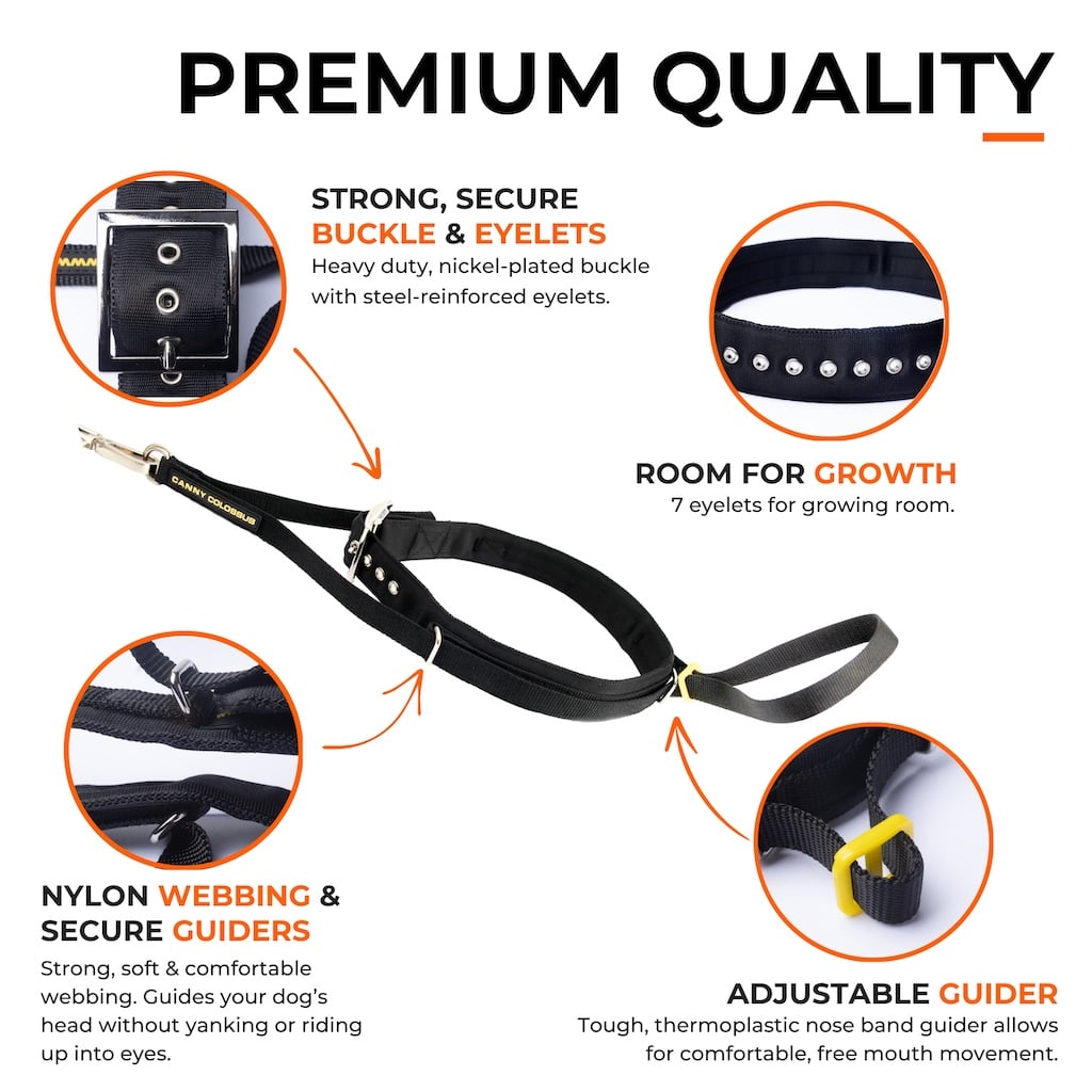 The Canny Colossus is the trusted, no pull dog head collar that helps train large breed dogs not to pull on the leash. Voted 'Best New Product' by the UK pet industry when first launched, it gently guides dogs to walk calmly beside their owners helping even the strongest pullers become calm & well-behaved on leash.